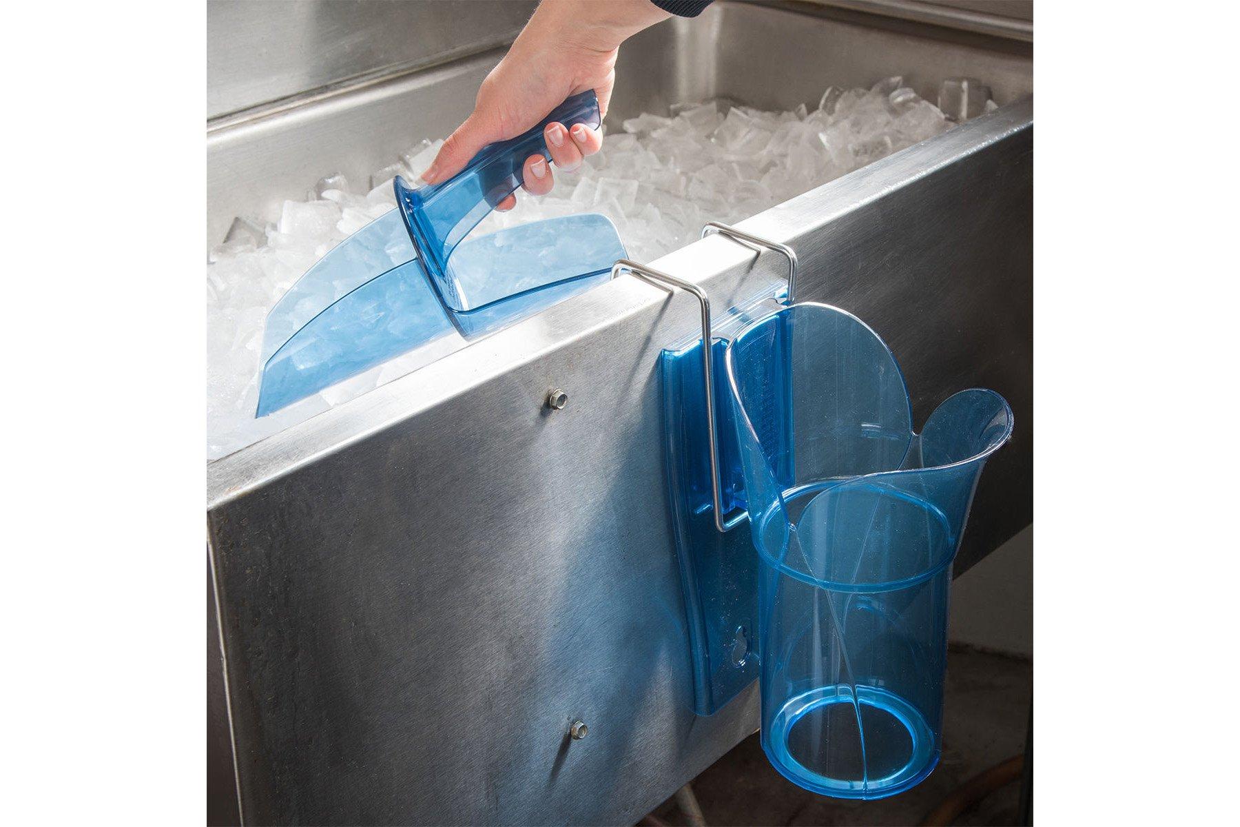 The Saf�T�Scoop's dome allows mounding of ice without spilling, reducing the number of scoops to fill Ice Totes by up to 50%. The Guardian provides safe, dedicated Scoop storage and mounts inside or outside of ice bins with included wire forms and hardware. The ergonomically angled handle provides outstanding balance and comfort and the Scoop's angled chute directs ice right into the Ice Tote, reducing the risk of dangerous slips from melted ice near the ice machine. It has a durable polycarbonate construction and is dishwasher safe and NSF listed.