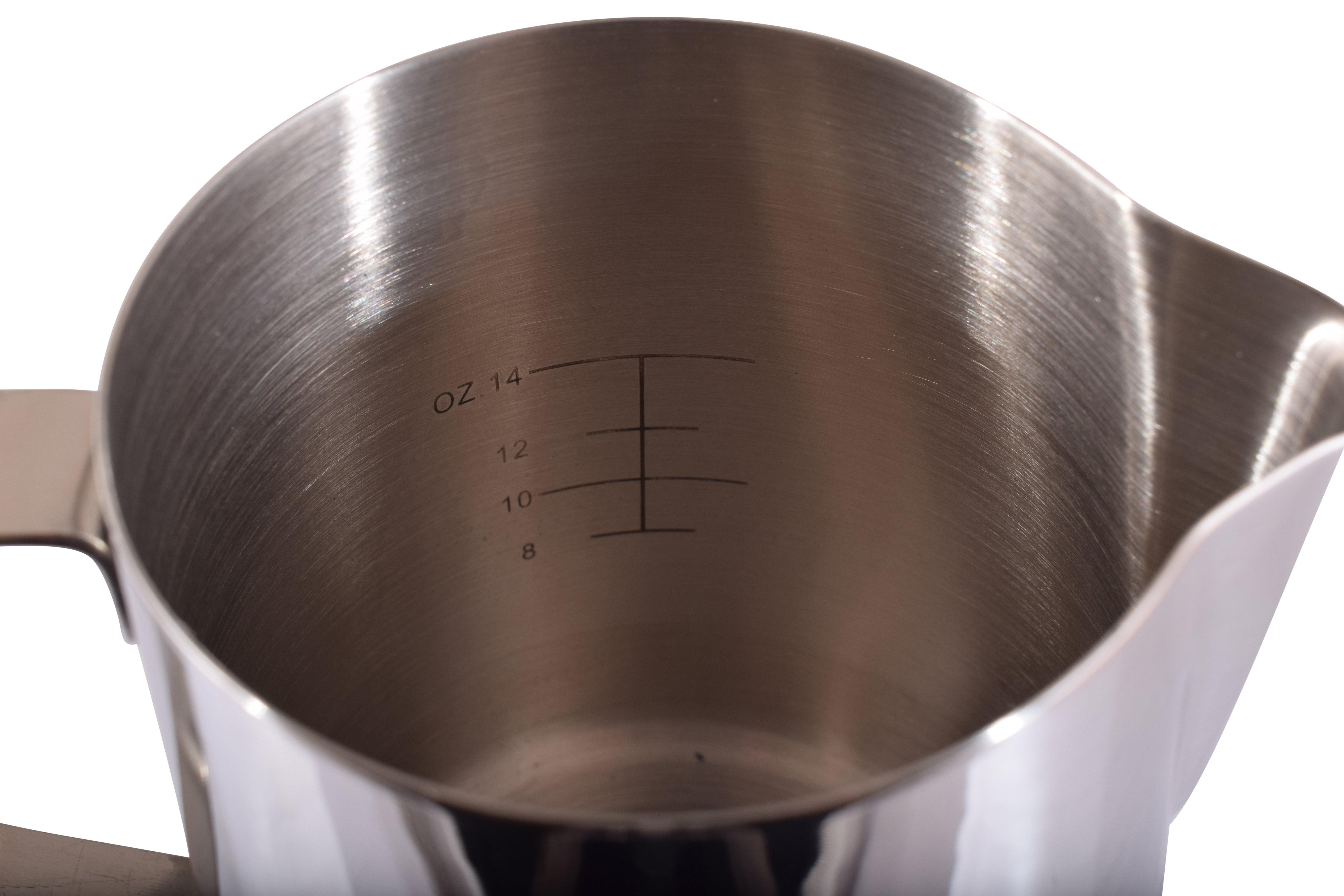 This professional quality Straight-sided Stainless Steel Foaming Jug from Yagua comes with lined measurements etched on both sides for right and left handed milk frothing (lined to 10oz from 4 in 2oz increments). This ensures improved accuracy and less wastage. It also has a narrow spout for superior pouring control and creating latte art.