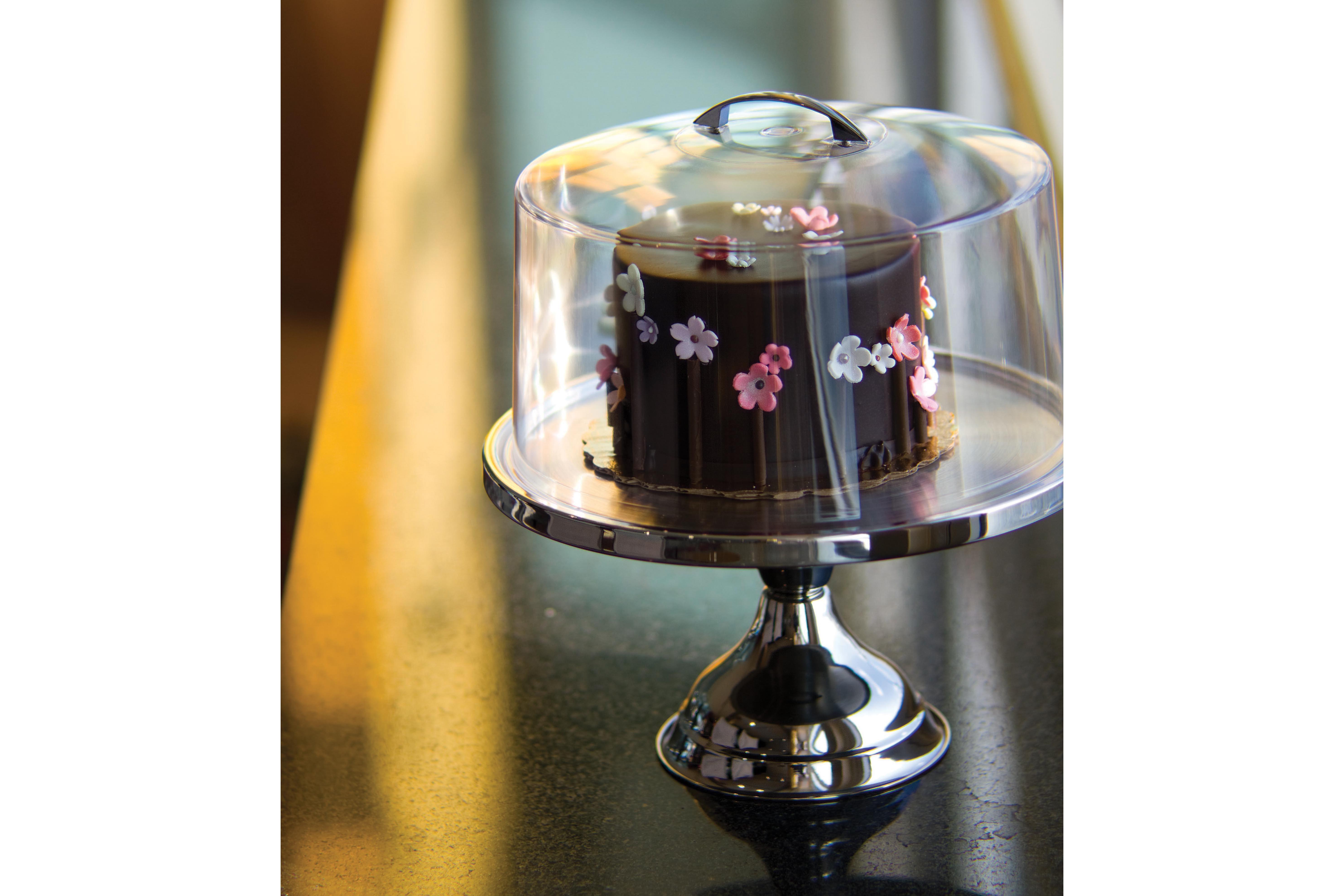 - Durable stainless steel pedestal cake plate with clear SAN plastic cover