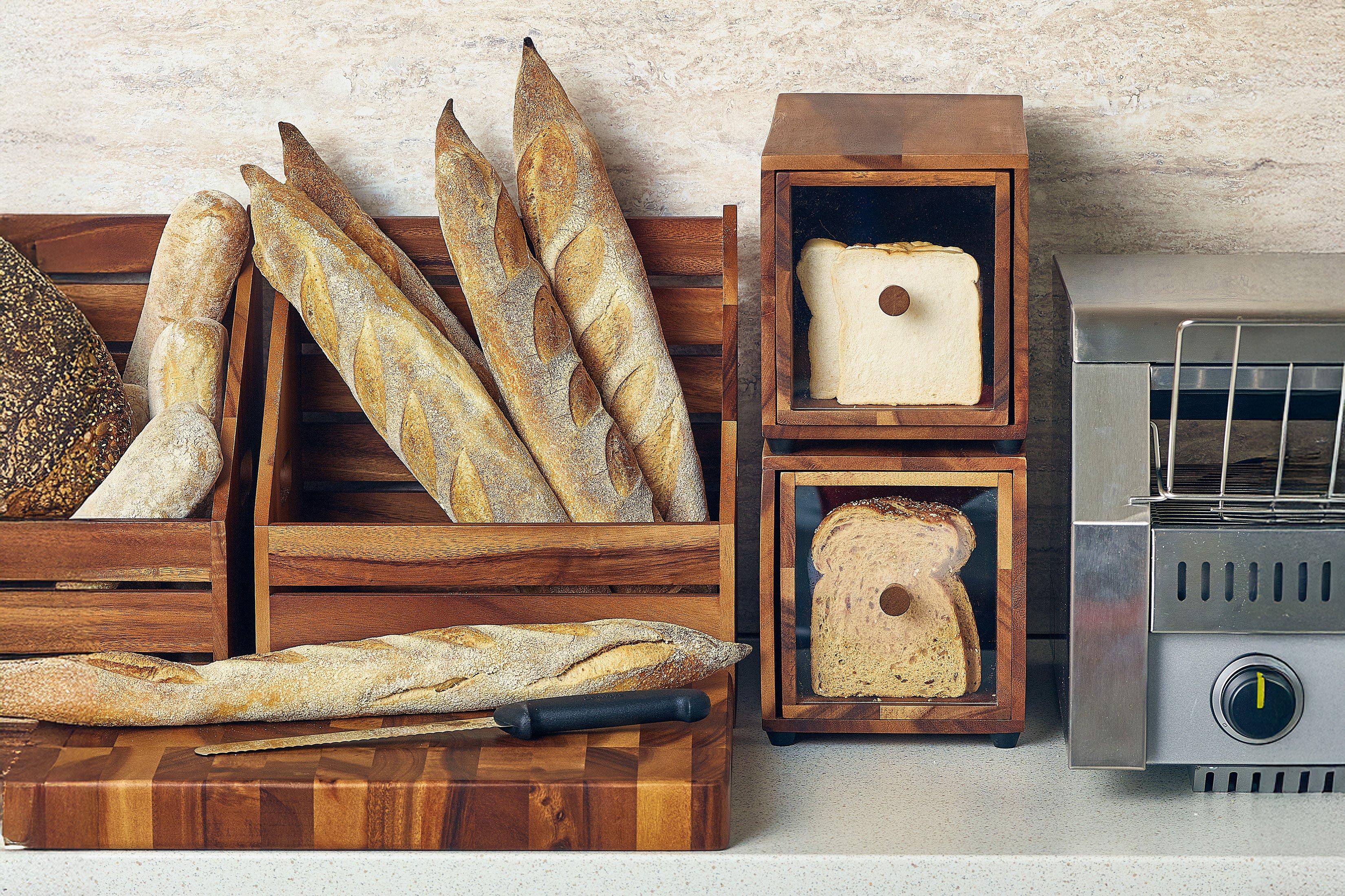 The GenWare Acacia Wood Bread Box, a buffet staple, is a fantastic option for storing multiple varieties of breads as part of a hotel's breakfast buffet offering