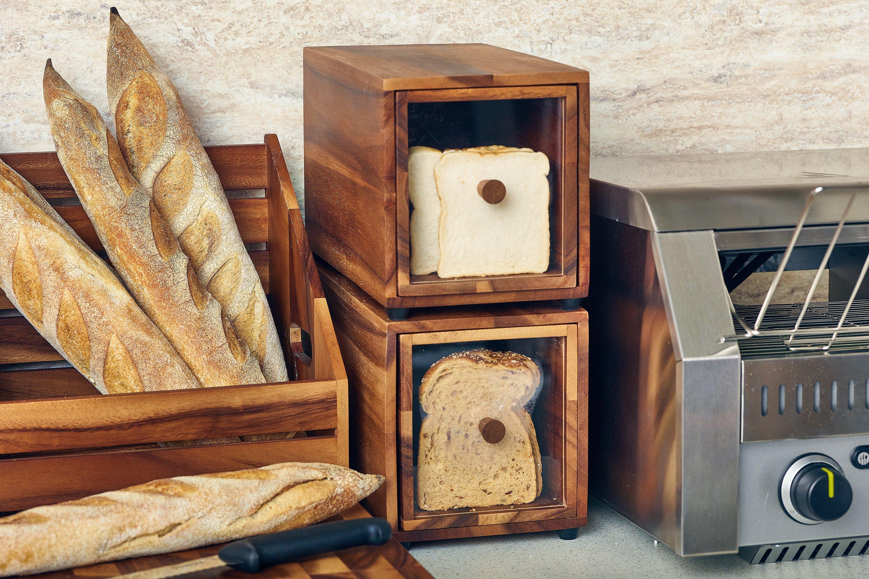 Size 17.6x32.5x19cmThe GenWare Acacia Wood Bread Box, a buffet staple, is a fantastic option for storing multiple varieties of breads as part of a hotel's breakfast buffet offering