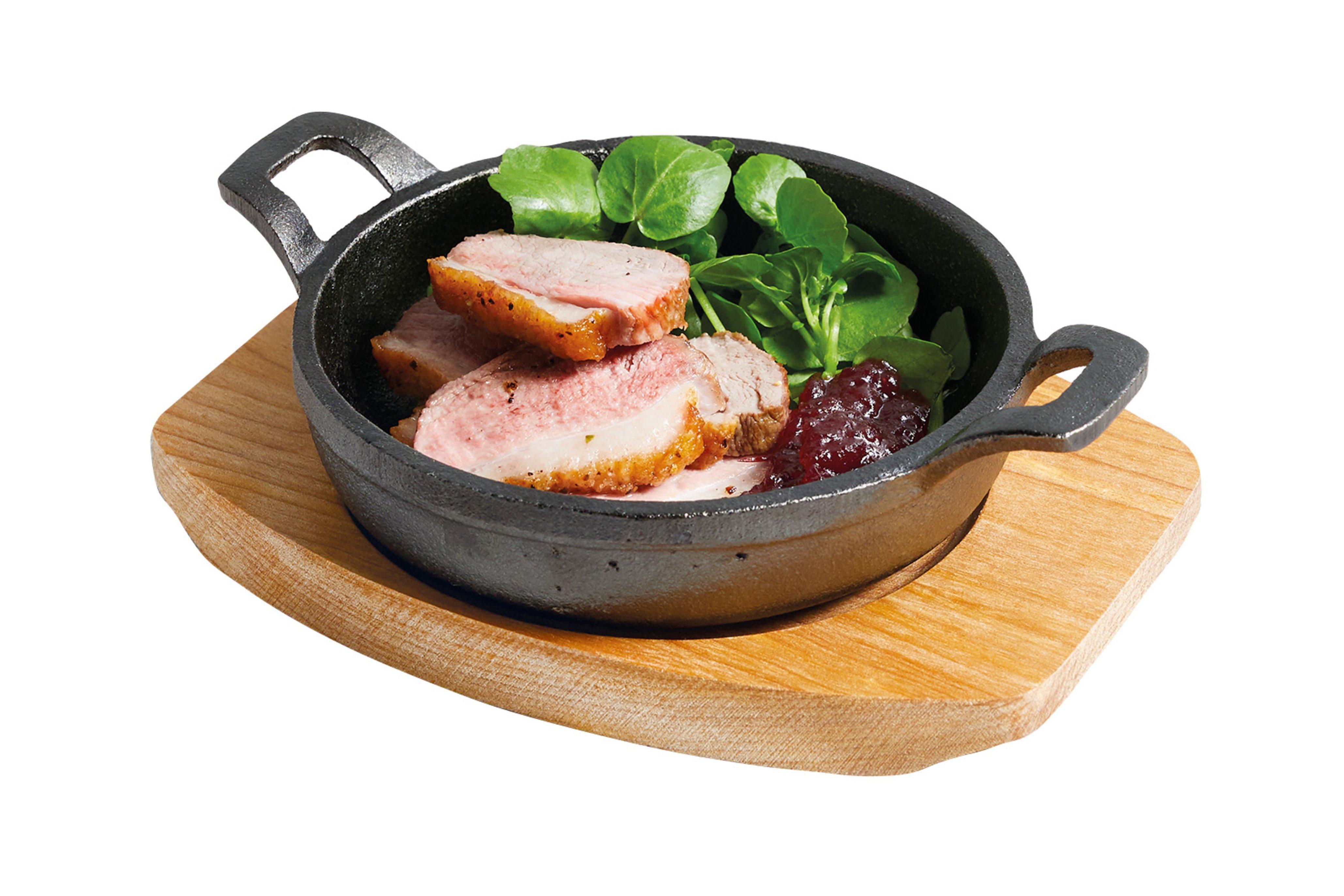 Induction safe and comes complete with maple wood serving stand. Serve in style, taking food directly from the oven to the table in elegant fashion. Ideal for cooking, presenting and serving appetisers, accompaniments and sauces
