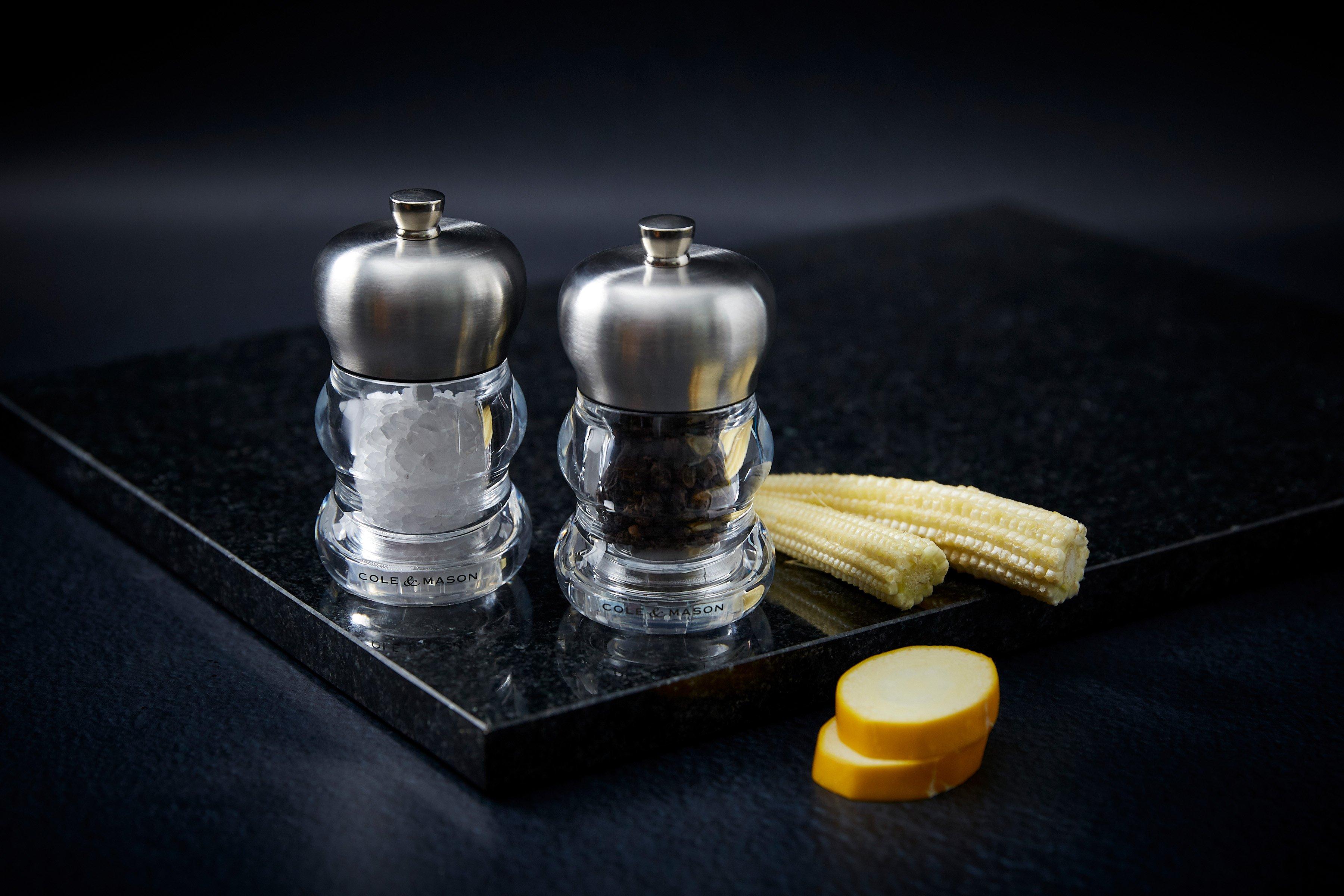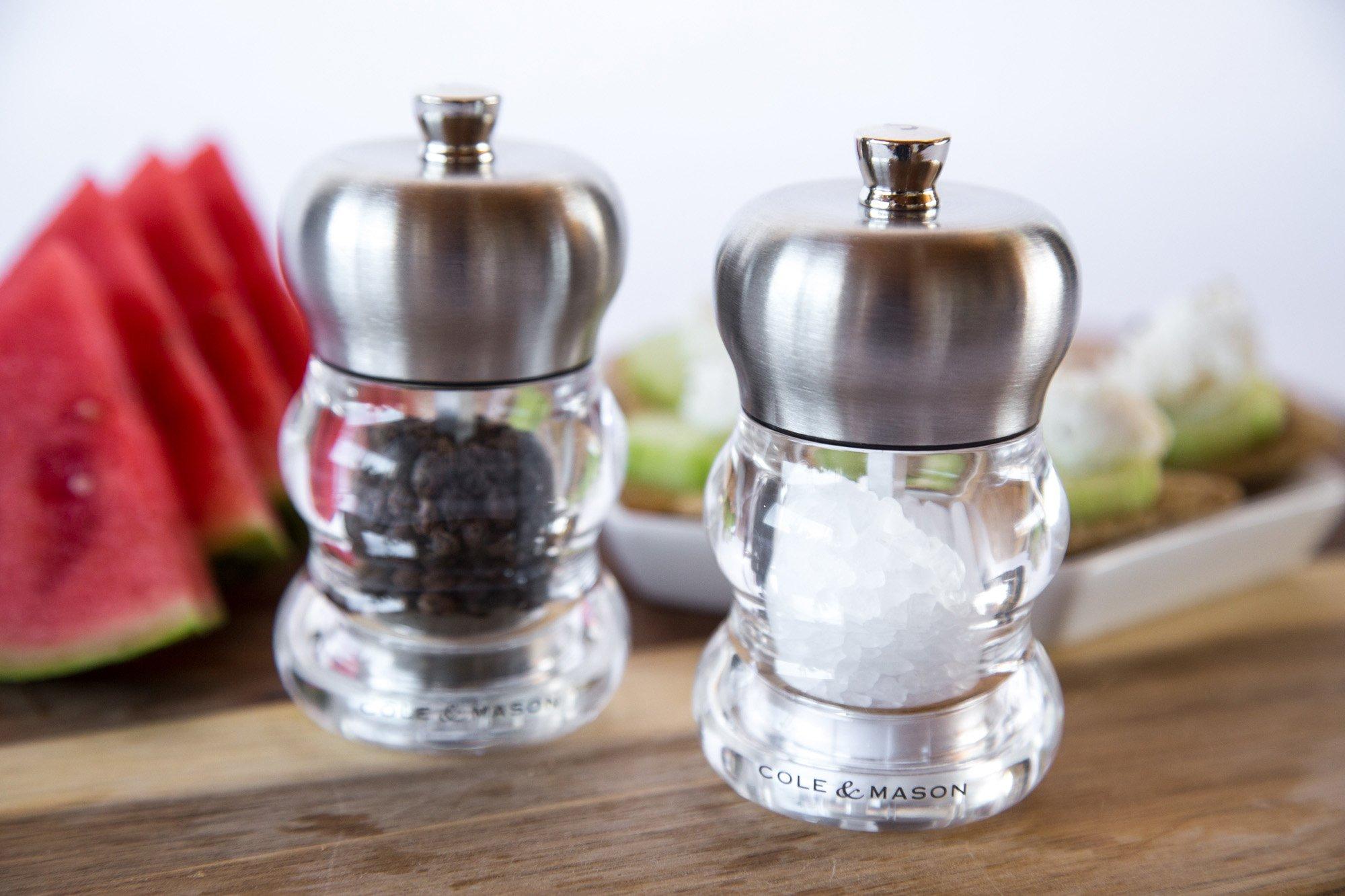 Create a stylish table top setting with these Ascot Salt and Pepper Mills from Cole and Mason. Made from a clear acrylic with a stainless steel finish top, they are perfect for both casual and fine dining occasions.