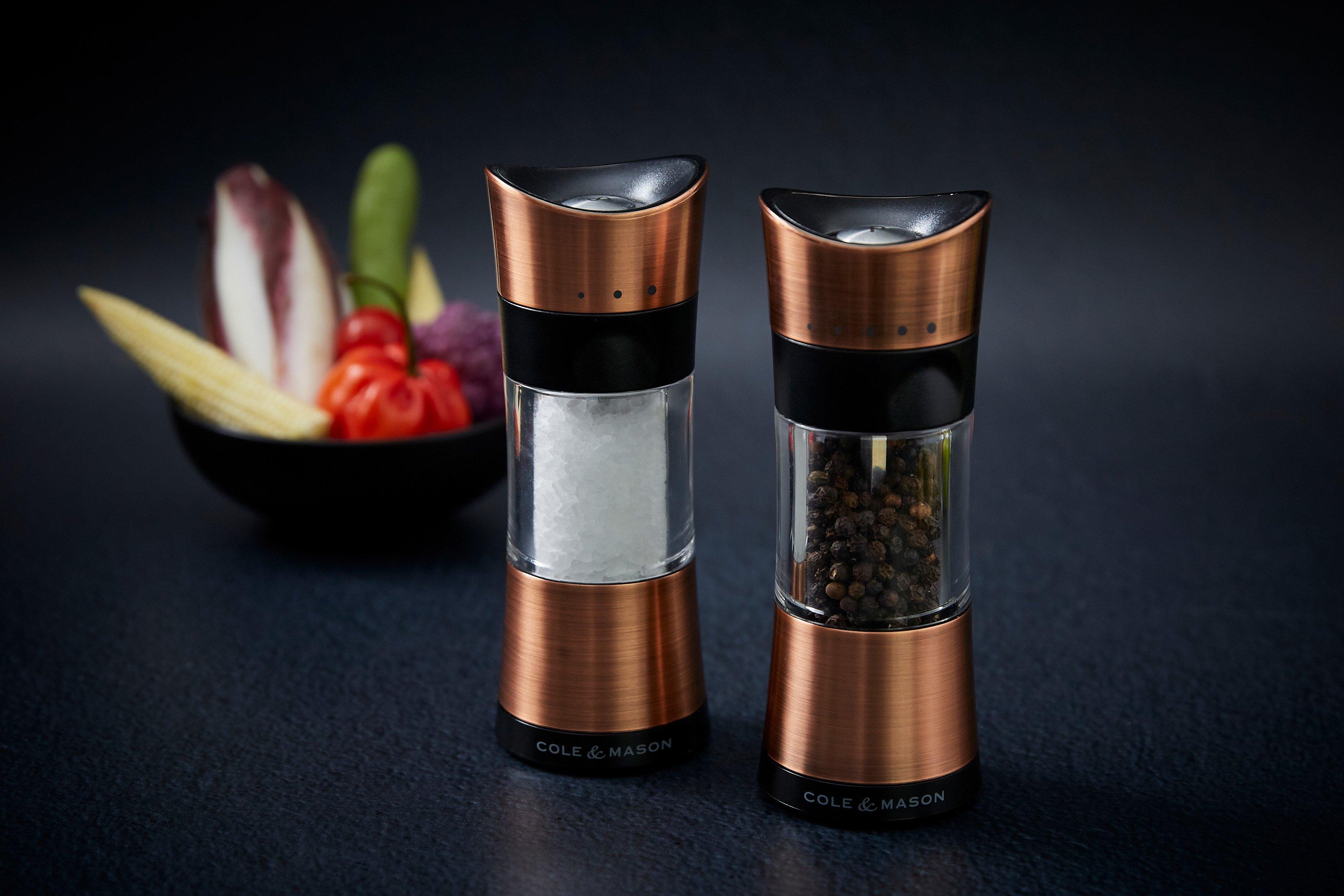 These contemporary style mills are made from durable acrylic and brushed copper, with the advantage of a clear body to easily see fill levels. It has a spring loaded mechanism with adjustable grind fine to coarse.