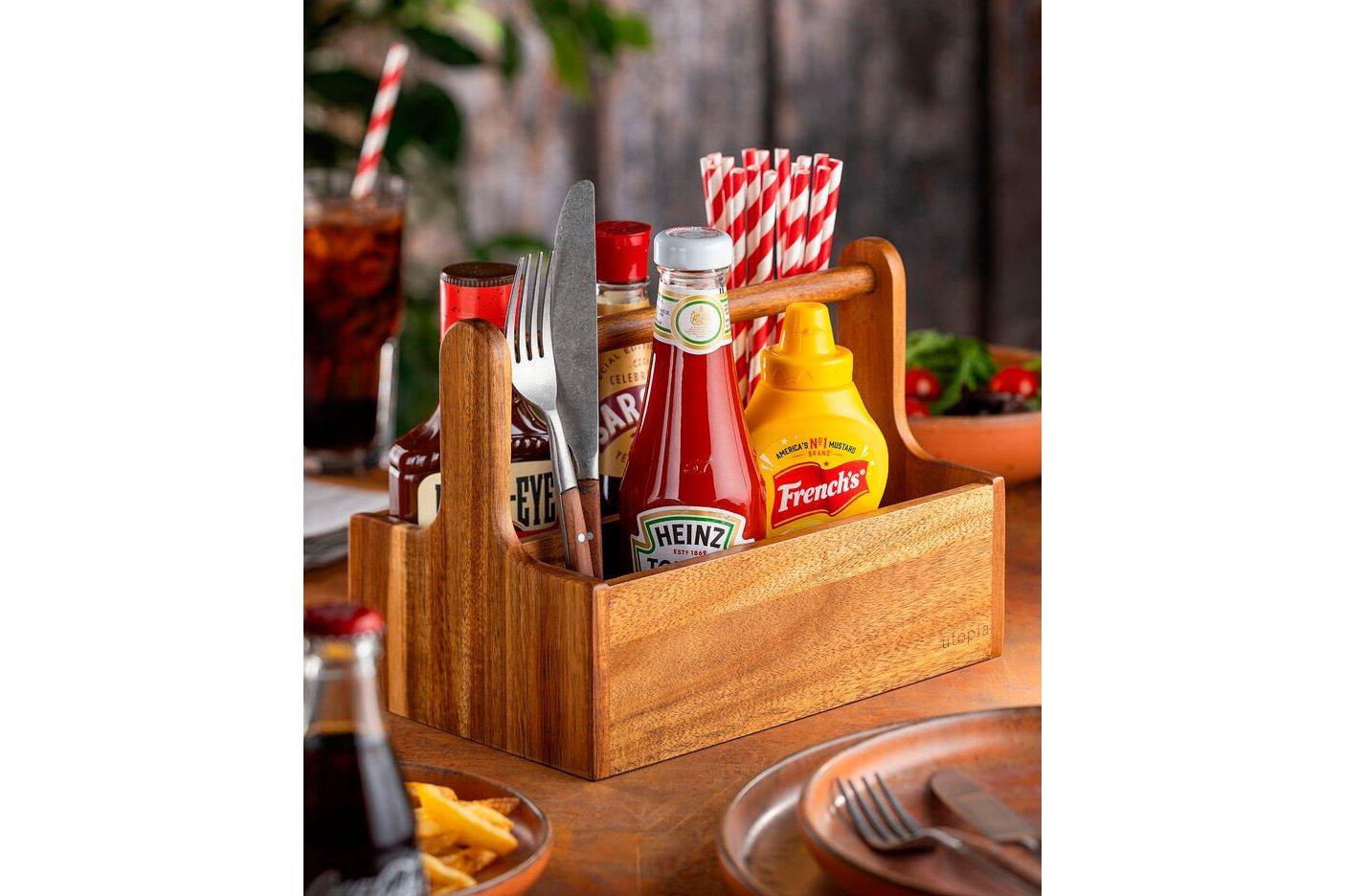 These beautifully crafted acacia wood table caddies are the perfect addition to the well-dressed table. Created from sustainable source they are an ideal way to present a range of tabletop items including condiments, cutlery and menus.
