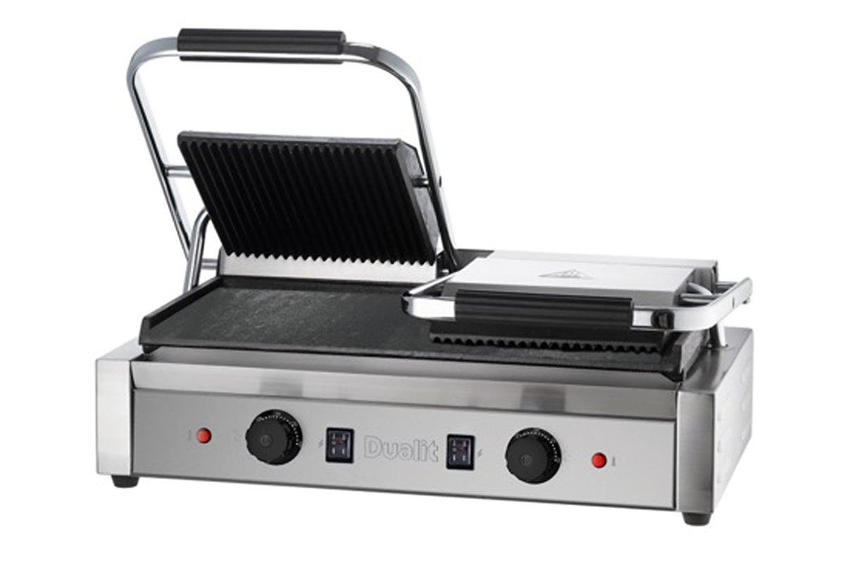 The Dualit Double Contact Grill comes with ribbed top plates and smooth bottom plates. With a temperature range of +50C to +300,C this unit is ideal for paninis, toasting and basic cooking. It has a heat resistant handle, a heating light, cleaning brush and a removable drip tray