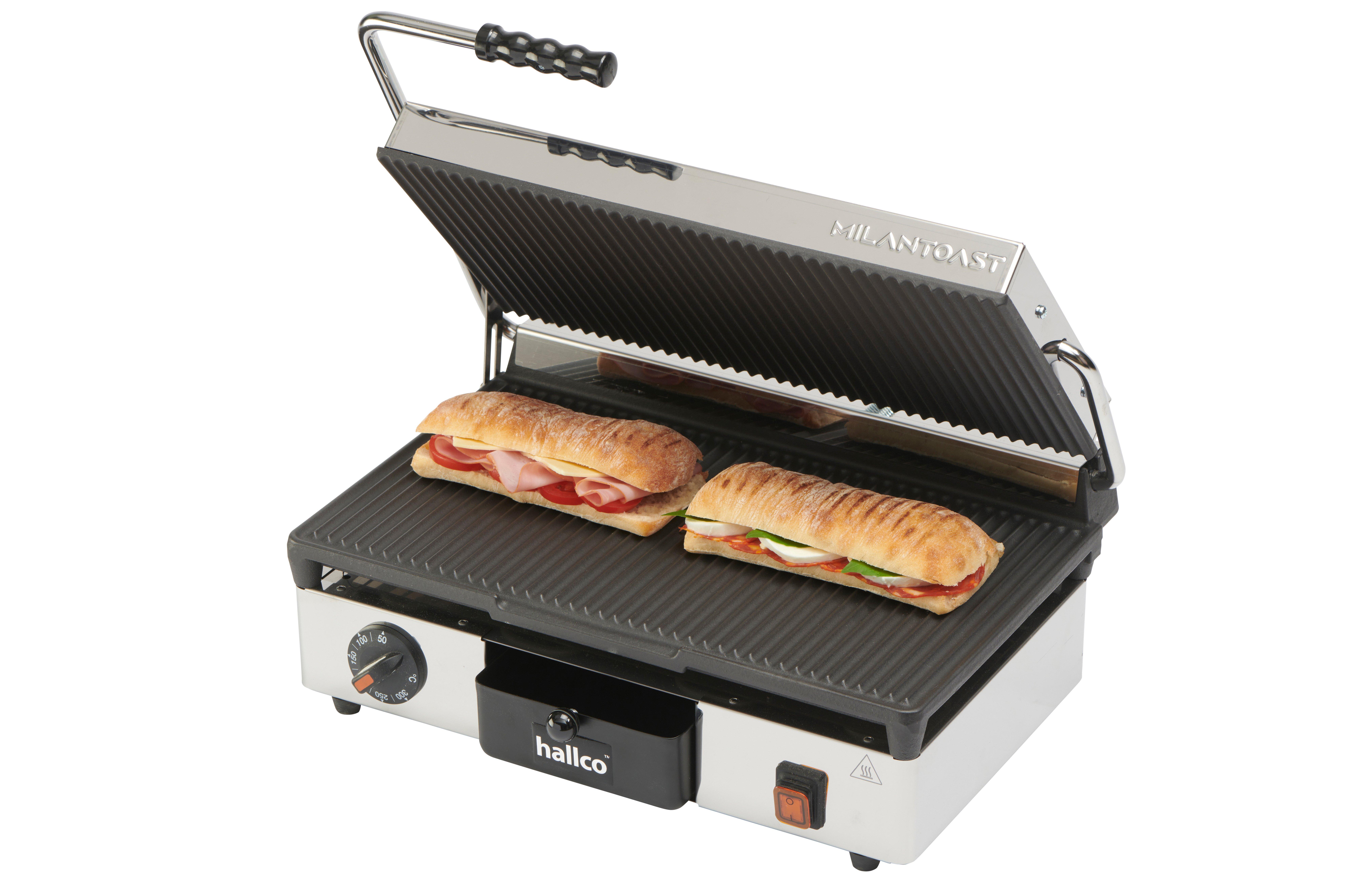 This Hallco (formerly Maestrowave) MEMT16030XNS Large Panini/Contact Grill is ideal for use in any catering establishment, perfect for hotels, restaurants, caf�s, delis and much more. The double grill is made from a stainless steel chassis with cast iron plates, which are durable, robust and ideal for long-term, continuous use. The heavy duty non stick cast iron plates have a ribbed top and bottom, which helps grill your food to perfection, whilst making ideal for grilling paninis and other bread products.