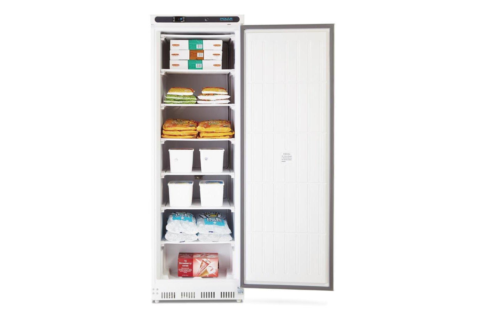 The lockable Polar CD613 Freezer has a white interior and exterior finish, 7 fixed shelves, and LED digital display and rear castors and functions within a temperature range of -25 to -10C.