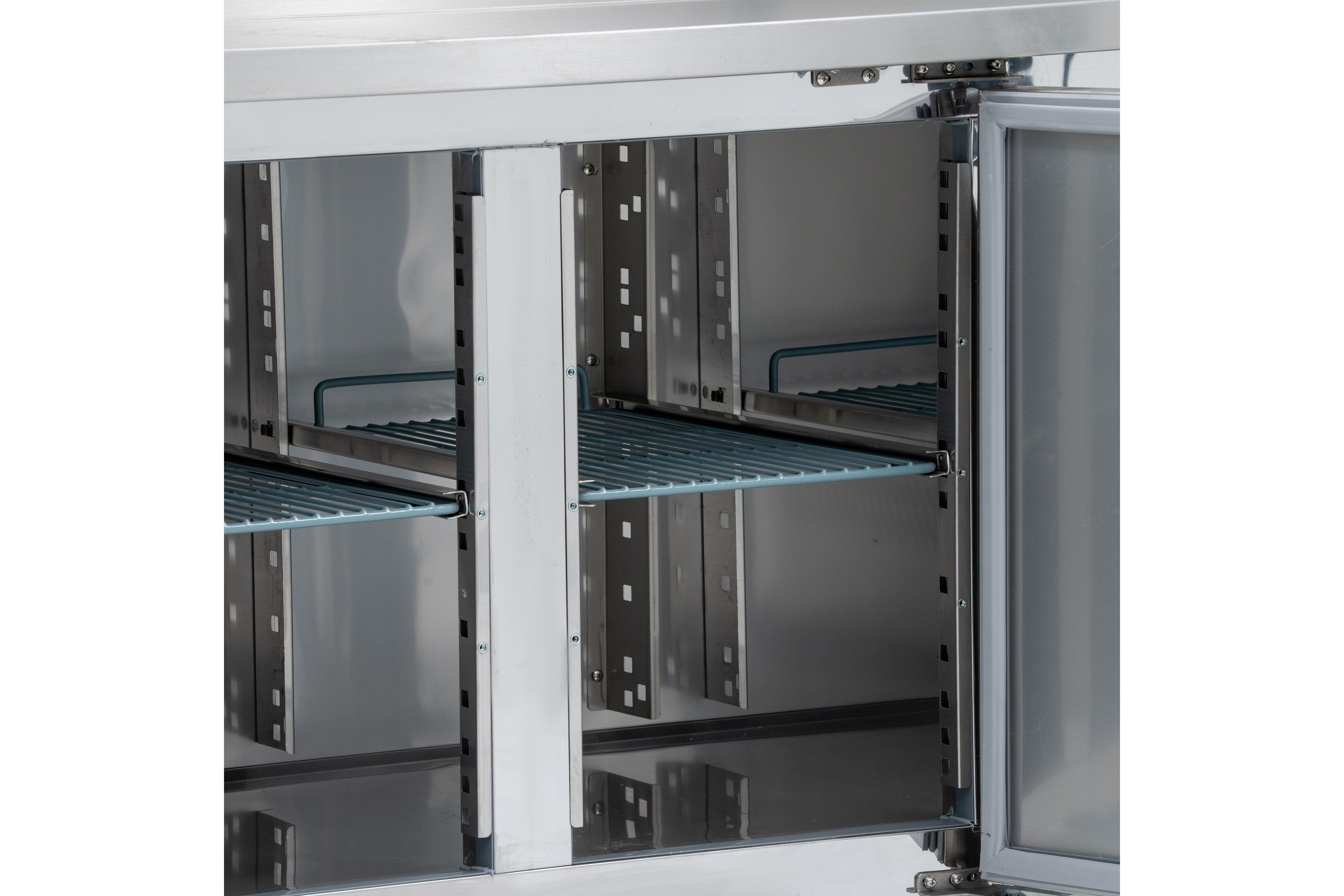 The interior of this prep counter has a 282 litres capacity and holds 1 x 1/1 GN shelf per door. It also accepts 6 x 1/3 gastronorm containers up to 150mm deep which are not supplied but are available separately here at Brakes. The doors are self closing for added convenience and replaceable gaskets for easy maintenance. The base features castors for easy maneuverability and transportation as well as static positioning when in use.