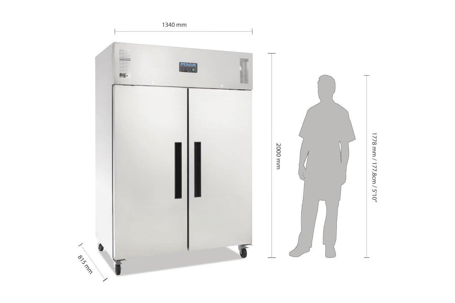 The dimensions of this Polar Double Door Stainless Steel Fridge are W1345xD815xH2000mm and can accommodate 20 x 2/1 gastronorms. It is supplied with a 2 year parts and labour warranty.