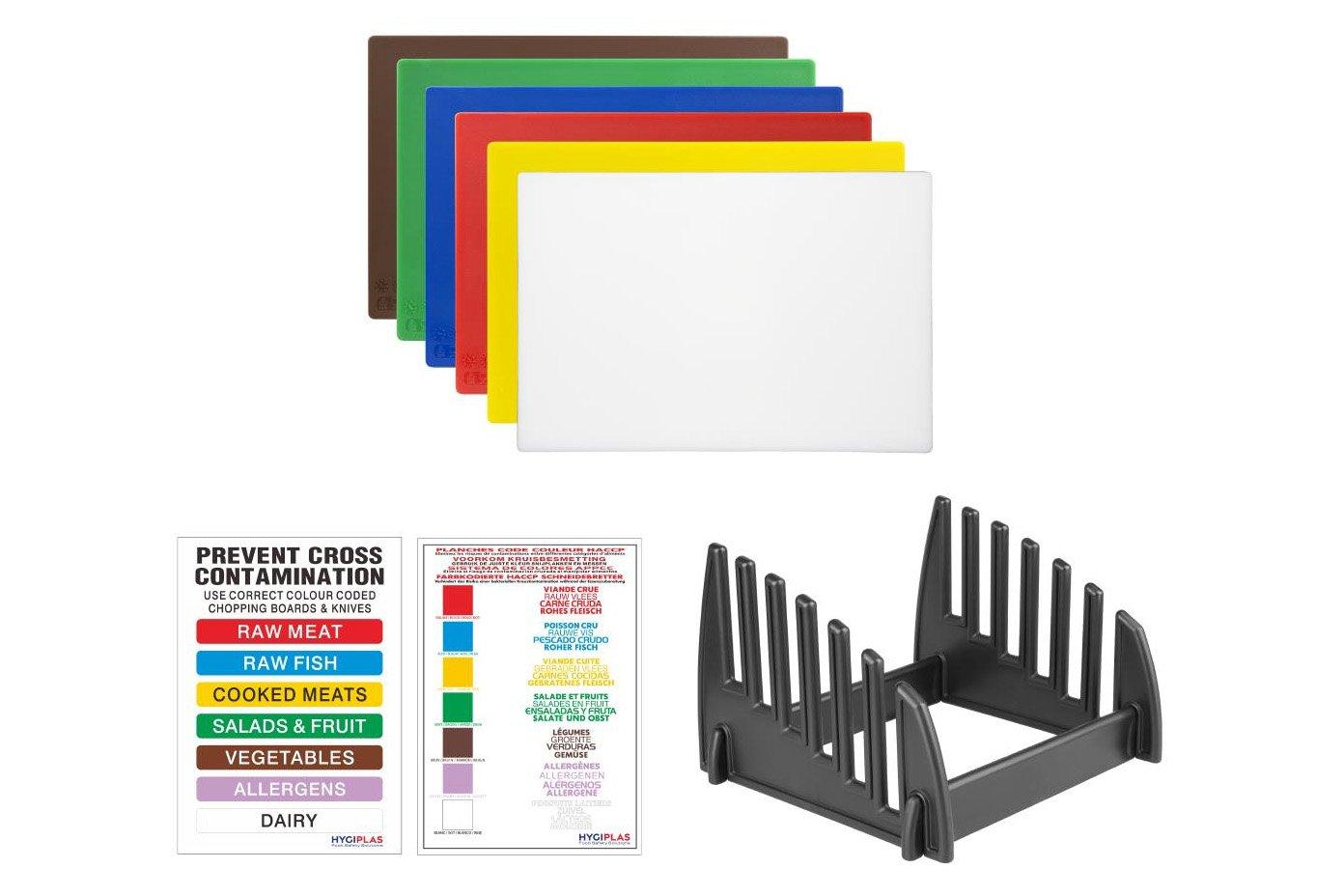 Size 45x30x1.25cm (18x12x0.5")This low density chopping board set contains six multi-coloured 18x12x0.5" boards, a stainless steel board rack and a colour coded wall chart �9x6".