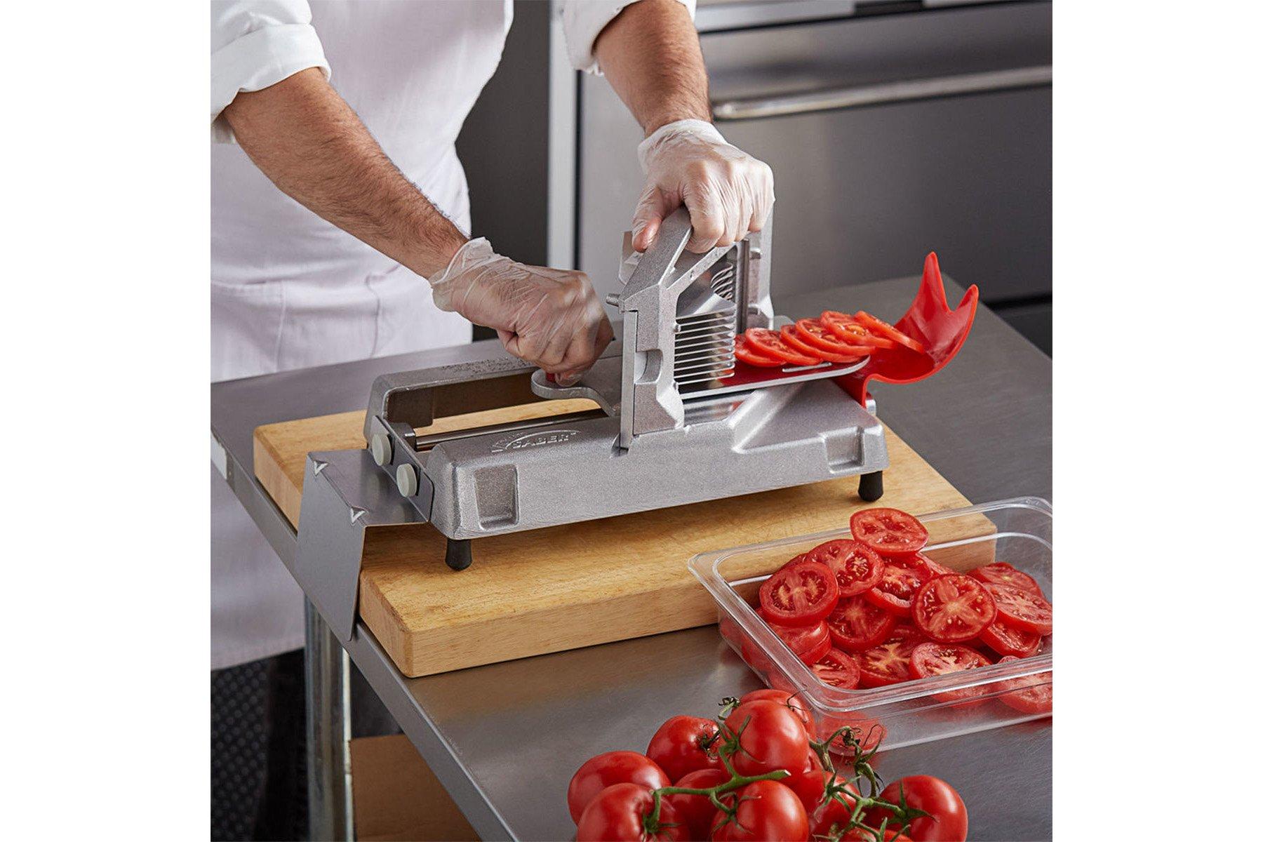 The Tomato Saber which is ideal for heavy duty use has a 9 blade cut giving 6.4mm (1/4") slices, and an ergonomically-designed contoured pusher handle that carries tomato through blades instead of rolling it.