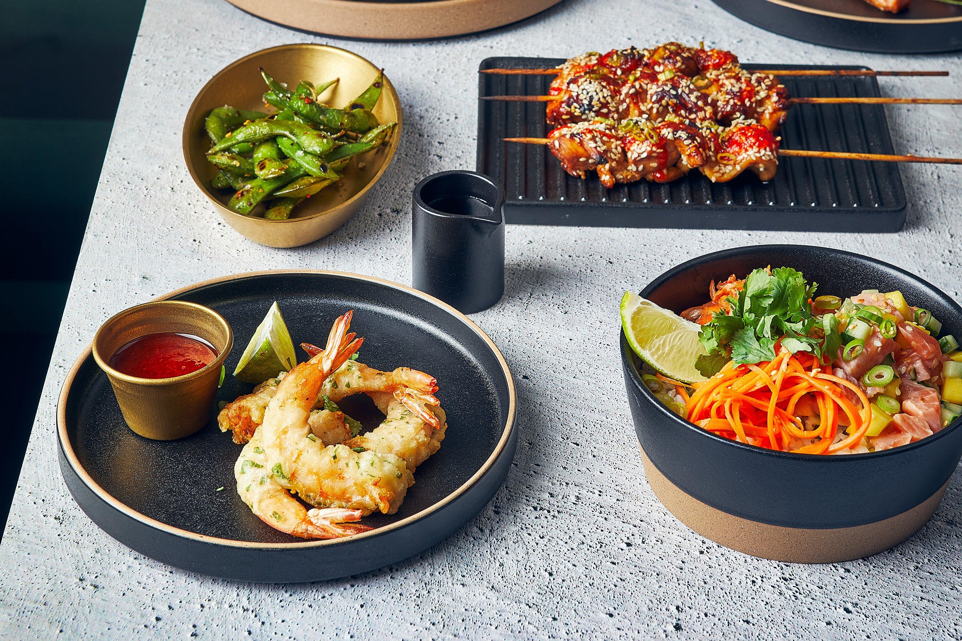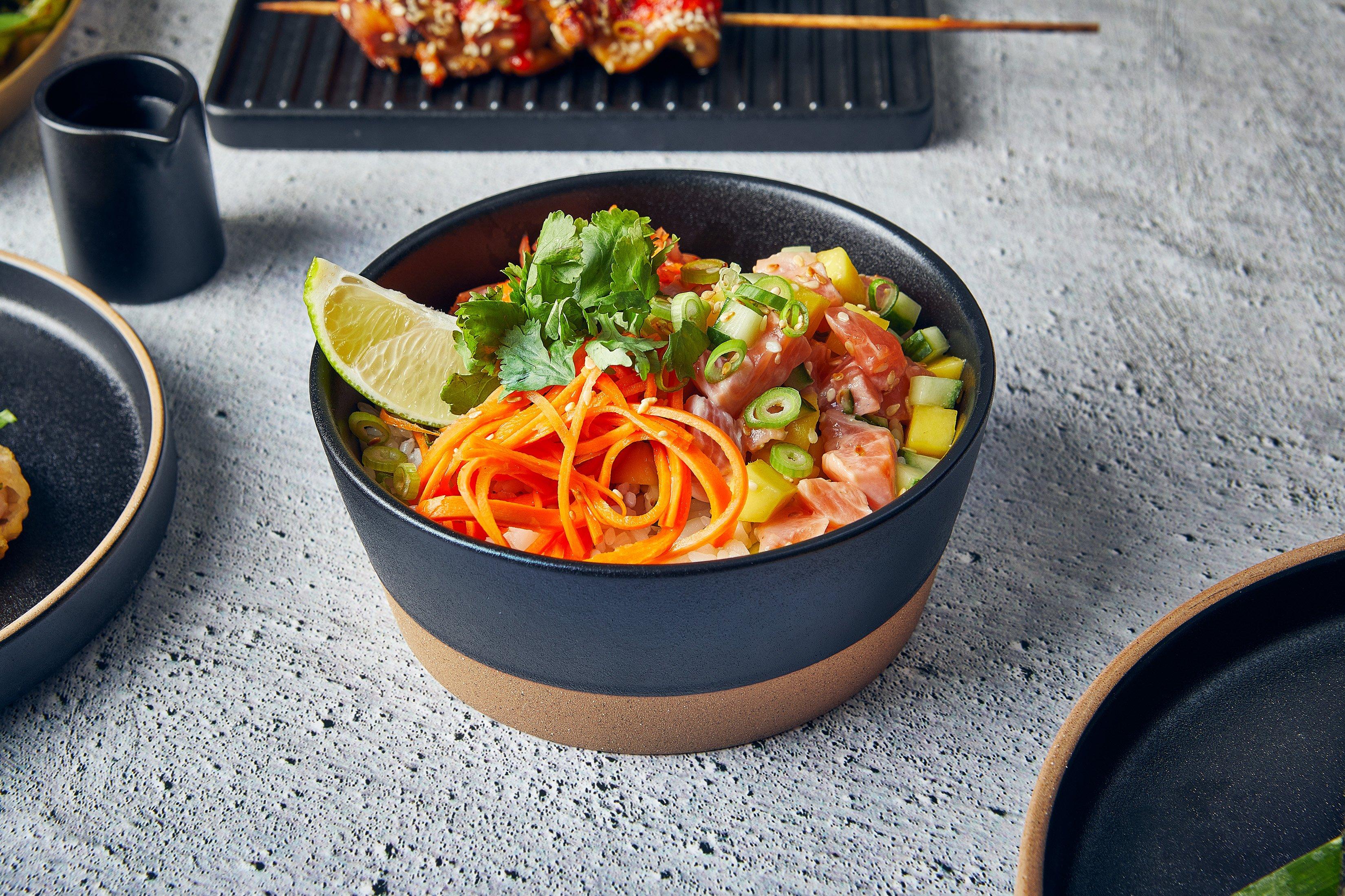 ?Kava Stoneware showcases a textured black glaze complemented by an unglazed edge/base, forming a captivating contrast for culinary creations.