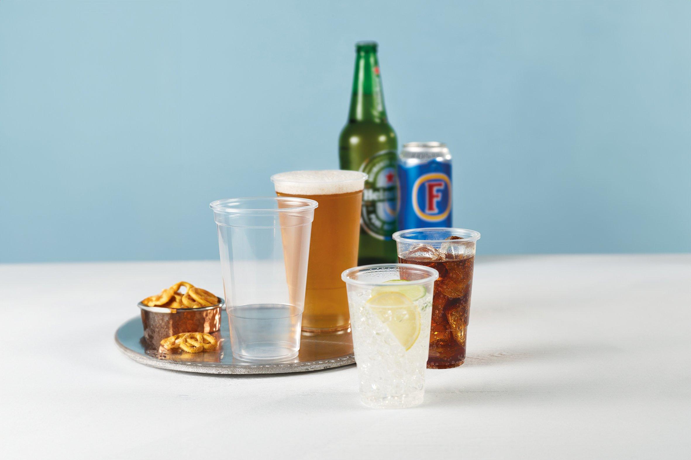 This Polypropylene Flexy Glass holds 610ml (21.5oz) lined at 568ml CE and it is sold in packs of 1000. Other types of glassware is available, including highball, tumbler, shot and whiskey glasses.