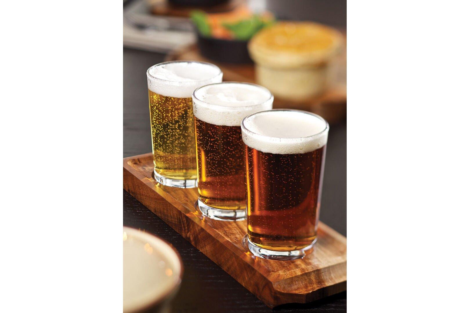 The Board is made from solid wood and has carved grooves that fit the separate taster wine or beer glasses that both hold 200ml. The boards are sold and in packs of 6.