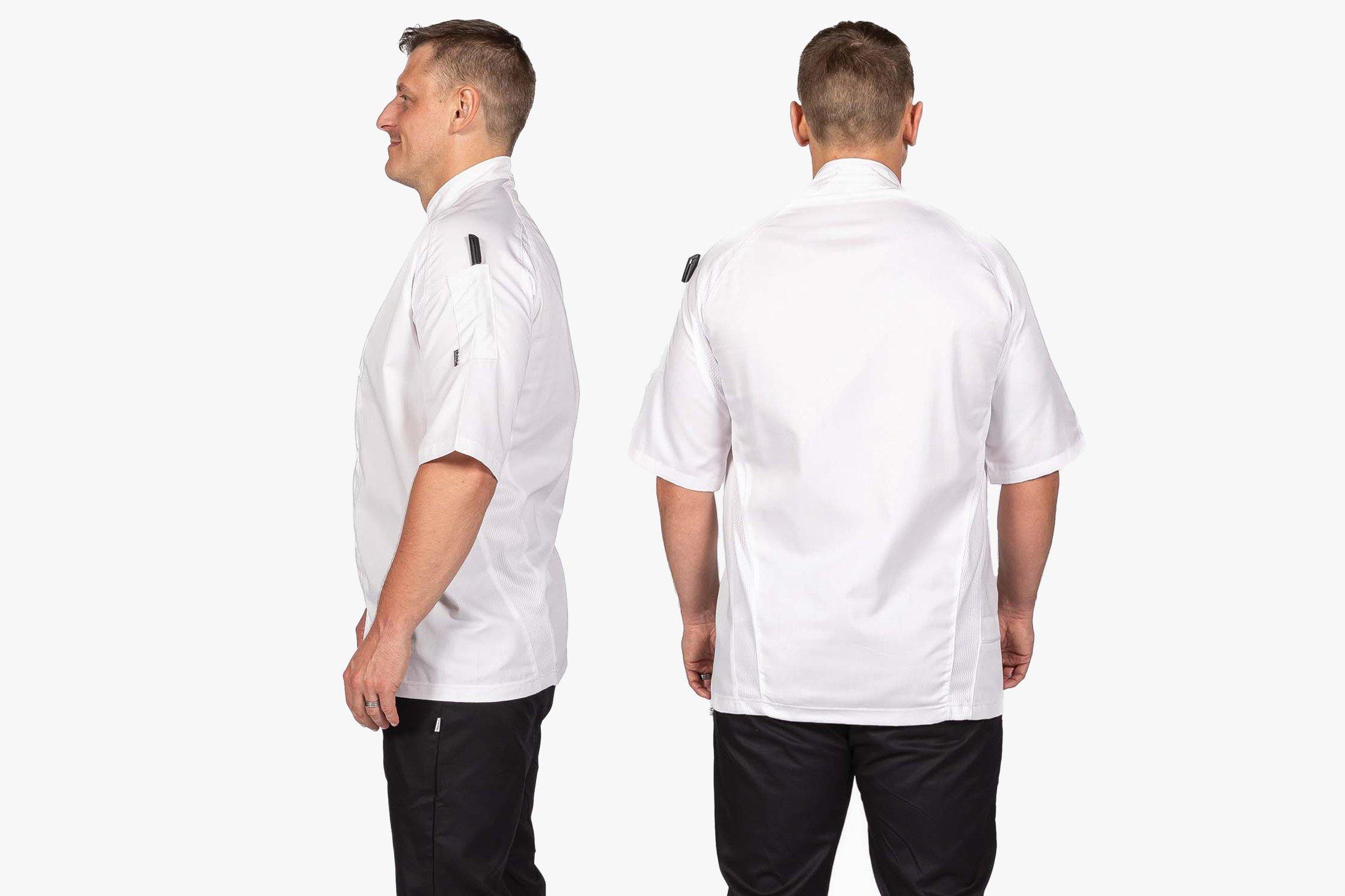 Le Chef and Cool and Lite and jackets are the lightest jacket you can buy with a and Coolmax back to allow rapid cooling. The short sleeves allow a greater air circulation to underarms and the loose cut design allows air to billow and circulate in and out. There are white stud fastenings and white piping down the front and zipped security pockets.