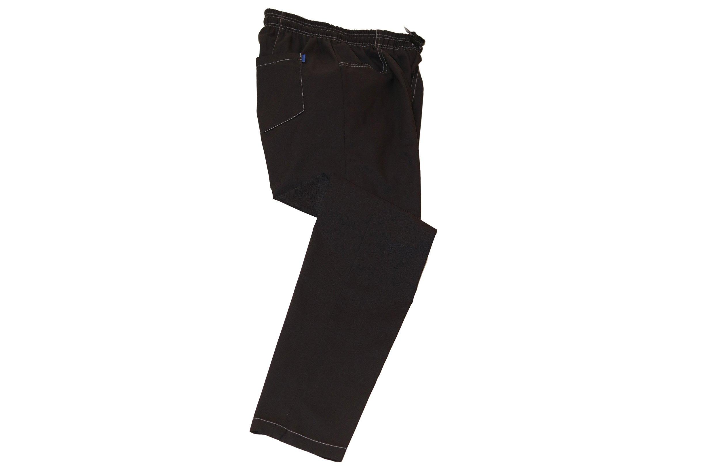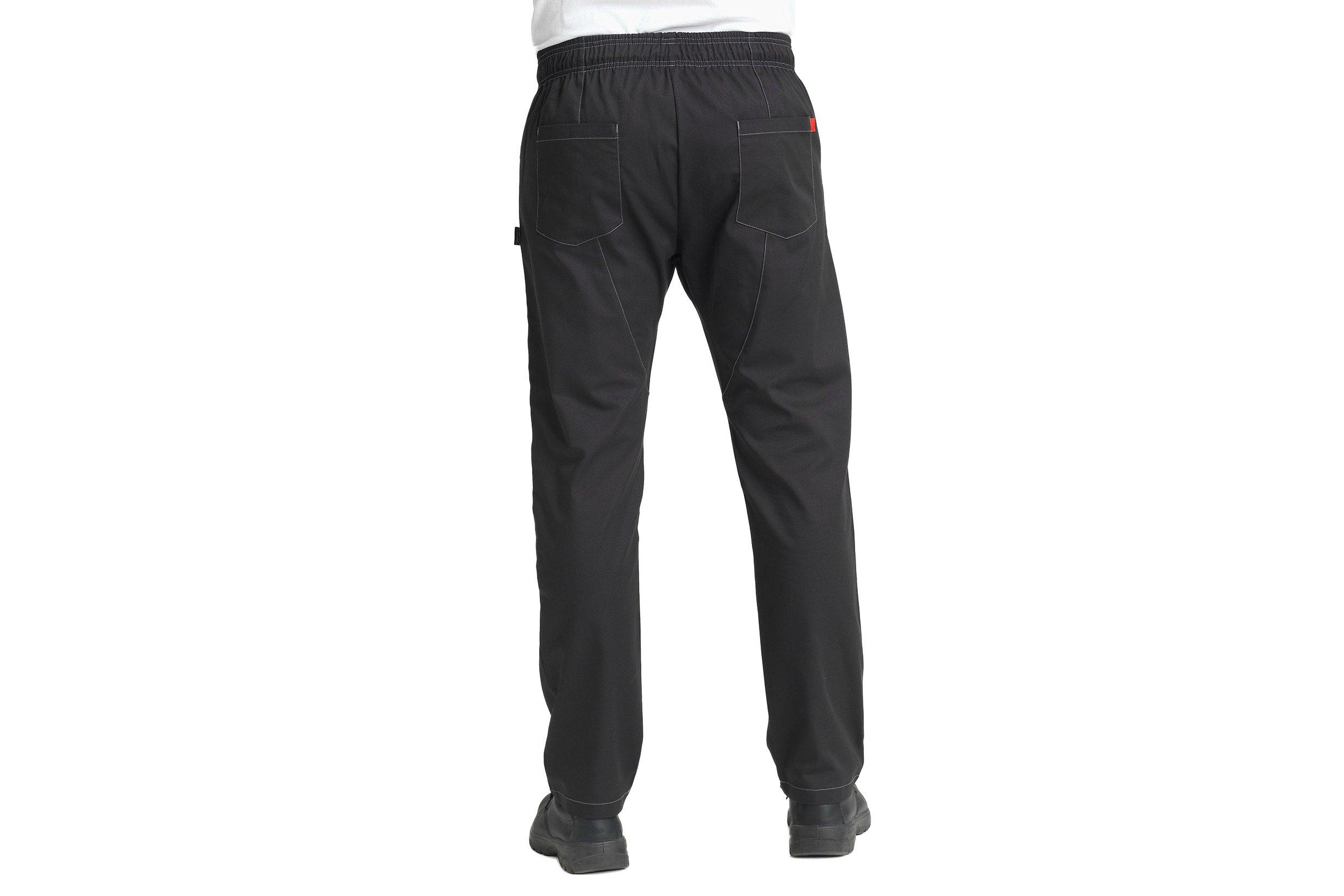 These Le Chef Prep Black Trousers have a slim fit style. Made from 50% polyester and 50% cotton 200gm with wide elasticated waistband drawstring. Dropped crotch with StayCool vent for airflow. Grey contrast stitching. Two jean style front pockets and two back pockets.